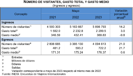 En el quinto mes de 2023, el ingreso de divisas referente al gasto total de visitantes internacionales ascendió a 2 mil 299.5 millones de dólares. En el mismo mes de 2022, el monto fue de 2 mil 232.8 millones y, en mayo de 2021, de mil 592 millones de dólares.