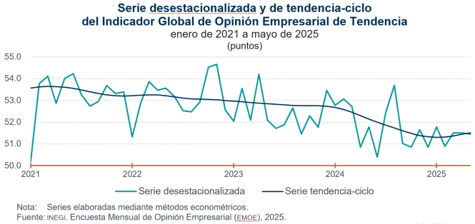 En mayo de 2025 y con cifras desestacionalizadas, el IGOET —que es el promedio ponderado de los indicadores de los cuatro sectores que lo integran— fue de 51.5 puntos, mismo nivel que el mes previo. En su comparación anual disminuyó 0.3 puntos. Con esta última observación, el indicador suma 60 meses seguidos por encima del umbral de los 50 puntos.