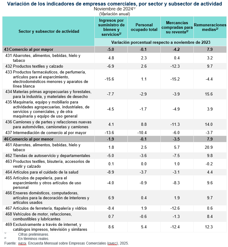 La Encuesta Mensual sobre Empresas Comerciales (EMEC) informa sobre el comportamiento económico de coyuntura de las principales variables del comercio interior del país. Además, no solo ofrece resultados sobre las variables de ingresos por suministro de bienes y servicios, personal ocupado total y remuneraciones medias, a nivel de sector 43, Comercio al por mayor, y 46, Comercio al por menor, sino también a nivel subsector de actividad y por entidad federativa.