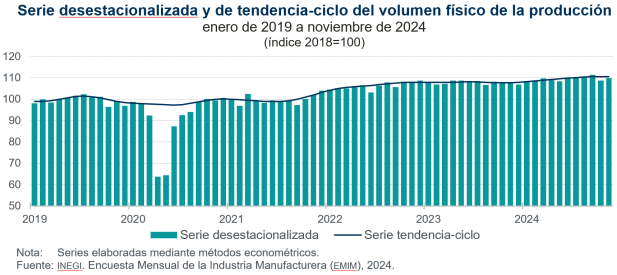 En noviembre de 2024 y con cifras desestacionalizadas, el volumen físico de la producción de la industria manufacturera presentó un alza de 1.1 % en su comparación mensual y de 2.0 %, a tasa anual.