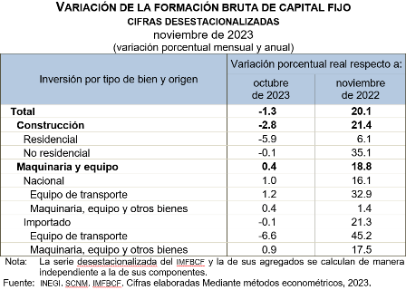 A tasa anual y con series desestacionalizadas, el IMFBCF incrementó 20.1 % en términos reales. A su interior, los gastos en construcción subieron 21.4 % y en maquinaria y equipo, 18.8 %, en noviembre de 2023.