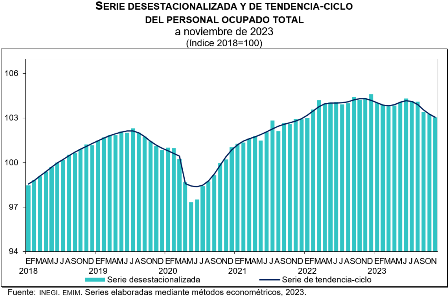 En noviembre de 2023 y con datos ajustados por estacionalidad, el personal ocupado total del sector manufacturero disminuyó 0.2 % y las horas trabajadas descendieron 0.5 % a tasa mensual. Las remuneraciones medias reales pagadas (sueldos, salarios y prestaciones sociales) aumentaron uno por ciento.