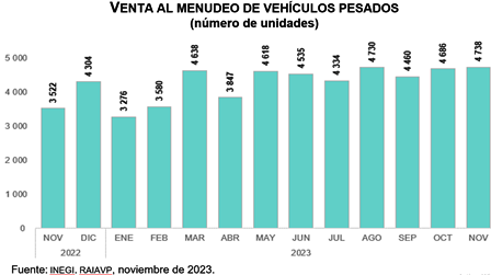 En noviembre de 2023, las 11 empresas que conforman este registro vendieron 4 mil 738 vehículos pesados al menudeo y 4 mil 868 al mayoreo, en el mercado nacional. Lo anterior representó una variación de 34.5 y de 29.2 %, respecto al mismo mes de 2022, respectivamente.