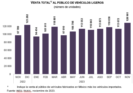 En noviembre y en el mercado interno, se vendieron al público 128 mil 961 unidades. Por su parte, en el periodo enero-noviembre de 2023, se comercializaron un millón 218 mil 474 unidades.