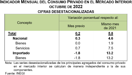 En octubre de 2022 y con cifras desestacionalizadas, el Indicador Mensual del Consumo Privado en el Mercado Interior (IMCPMI) –que mide el comportamiento del gasto de los hogares residentes del país en bienes y servicios de consumo, tanto de origen nacional como importado y excluyen las compras de viviendas u objetos valiosos-, incrementó, en términos reales, 0.2 % a tasa mensual.