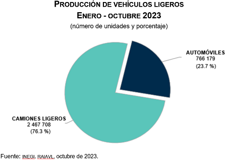 Durante enero-octubre de 2023, se comercializaron un millón 089 mil 513 vehículos ligeros y, en este mismo periodo, se produjeron 3 millones 233 mil 887 unidades en México. Los camiones ligeros representaron 76.3 % del total producido, mientras que el resto correspondió a la fabricación de automóviles.