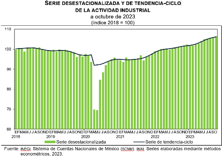 En octubre de 2023 y con cifras desestacionalizadas, la actividad industrial aumentó 0.6 % a tasa mensual.