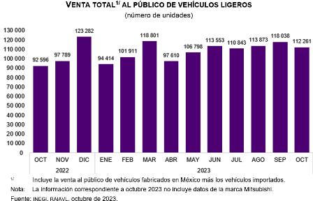 El Instituto Nacional de Estadística y Geografía (INEGI) da a conocer el avance de las ventas al público en el mercado interno, según el Registro Administrativo de la Industria Automotriz de Vehículos Ligeros (RAIAVL), en octubre del presente año.