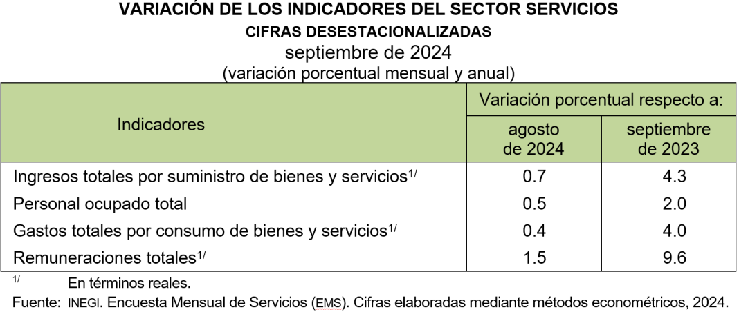 En septiembre de 2024, a tasa anual y con cifras ajustadas por estacionalidad, el índice agregado de ingresos totales reales por suministro de bienes y servicios creció 4.3 %; el de personal ocupado total, 2.0 %; el de gastos totales reales por consumo de bienes y servicios, 4.0 % y el de remuneraciones totales, 9.6 por ciento.