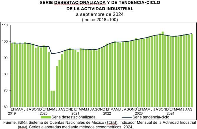 En septiembre de 2024 y con cifras desestacionalizadas, la actividad industrial aumentó 0.6 % a tasa mensual.
