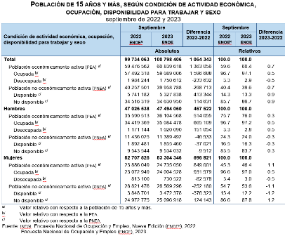 En septiembre de 2023 y con cifras originales, la Población Económicamente Activa (PEA) fue de 60.8 millones de personas, lo que implicó una Tasa de Participación de 60.4 por ciento. Dicha población fue superior en 1.4 millones de personas a la de septiembre de 2022. La Población No Económicamente Activa (PNEA) fue de 40 millones de personas, 299 mil personas menos que en el noveno mes de 2022.