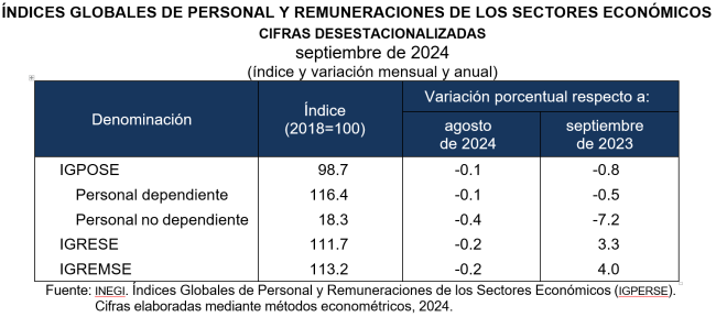 A tasa anual y con series desestacionalizadas, en septiembre de 2024, el IGPOSE bajó 0.8 por ciento. El IGRESE subió 3.3 % y el IGREMSE, 4.0 por ciento.