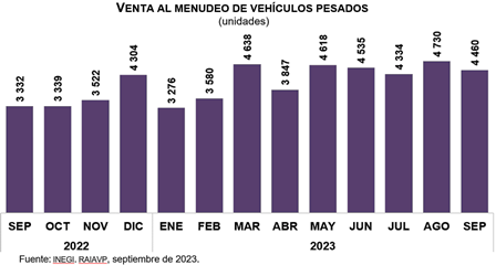 En septiembre de 2023, las 11 empresas que conforman este registro vendieron 4 mil 460 vehículos pesados al menudeo y 4 mil 581 al mayoreo, en el mercado nacional. Lo anterior representó una variación de 33.8 y de 21.0 %, respecto al mismo mes de 2022.