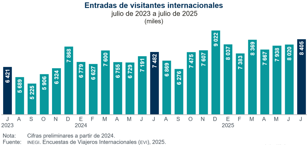 En julio de 2025 ingresaron al país 8 millones 405 mil 393 visitantes, 12.3 % más que en el mismo mes de 2024. De esta cantidad, 4 millones 245 mil 420 (50.5 %) fueron turistas internacionales —viajeras y viajeros residentes en el extranjero que pernoctaron en México—, 6.1 % superior al mismo mes de un año antes, y 4 millones 159 mil 973 (49.5 %) fueron excursionistas —visitantes que no pernoctaron en su viaje—.