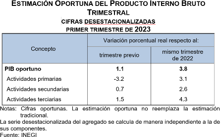 En el primer trimestre de 2023 y con cifras ajustadas por estacionalidad, los resultados de la Estimación Oportuna del Producto Interno Bruto Trimestral (EOPIBT) muestran un aumento de 1.1 %, en términos reales, con respecto al trimestre inmediato anterior.