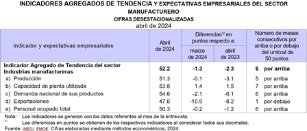 En abril de 2024 y con cifras desestacionalizadas, el IAT del sector manufacturero fue de 52.2 puntos, lo que significó una reducción mensual de 1.3 puntos.