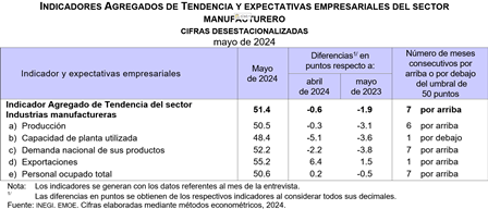 En mayo de 2024 y con cifras desestacionalizadas, el IAT del sector manufacturero fue de 51.4 puntos, lo que significó una reducción mensual de 0.6 puntos.