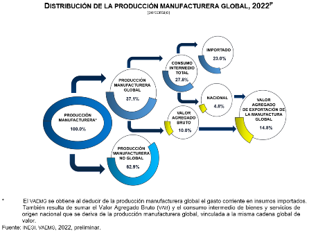 En 2022, la producción manufacturera global registró un monto de 7 billones 486 mil 073 millones de pesos a precios básicos -precios de los bienes o servicios valorados en el establecimiento de la o del productor; se excluyen los gastos de transporte y los impuestos netos a los productos, como el Impuesto al Valor Agregado-. La cifra representó 37.1 % del valor de la producción total de la industria manufacturera: los insumos importados participaron con 23.0 % de la producción manufacturera total, el consumo intermedio de origen nacional lo hizo con 4.8 % y el valor agregado bruto, con 10.0 por ciento. En el mismo periodo, el VAEMG registró un monto de 3 billones 140 mil 791 millones de pesos corrientes.