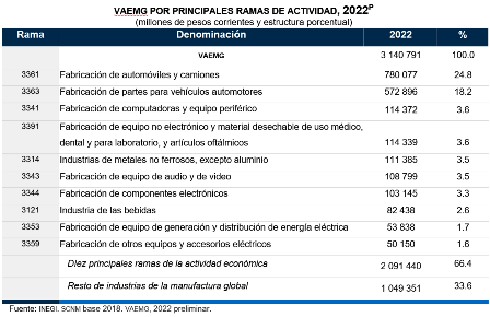 En 2022, de las ramas de la industria manufacturera que participaron en las cadenas globales de valor, destacó la de fabricación de automóviles y camiones. Esta contribuyó con 24.8 % del VAEMG total. La fabricación de equipos y otros accesorios eléctricos lo hizo con 1.6 por ciento. En conjunto, las 10 ramas de actividad aportaron 66.4 % del VAEMG durante 2022.
