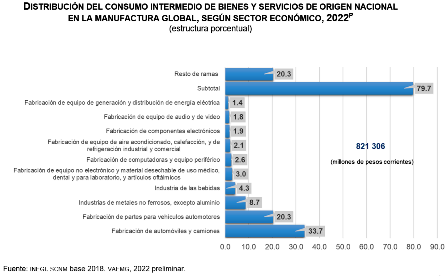 A nivel de rama, el consumo intermedio de la industria manufacturera se distribuyó de la siguiente manera: fabricación de automóviles y camiones concentró 33.7 % y se colocó como la principal actividad demandante de insumos nacionales. Siguieron fabricación de partes para vehículos automotores, con 20.3 %; industrias de metales no ferrosos, excepto aluminio, con 8.7 %; industrias de las bebidas, con 4.3 %; fabricación de equipo no electrónico y material desechable de uso médico y dental y artículos oftálmicos, con 3.0 %; fabricación de computadoras y equipo periférico, con 2.6 % y fabricación de equipo de aire acondicionado, calefacción y refrigeración industrial y comercial, con 2.1 por ciento.