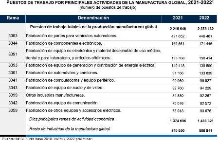 Por rama de actividad manufacturera, fabricación de partes para vehículos automotores contribuyó con 18.8 % de los puestos de trabajo totales de las actividades manufactureras globales; fabricación de equipo no electrónico y material desechable de uso médico, dental y para laboratorio, y artículos oftálmicos lo hizo con 7.2 %; fabricación de componentes electrónicos, con 6.3 %; fabricación de equipo de audio y de video, con 5.9 %; fabricación de computadoras y equipo periférico, con 5.6 %; otras industrias manufactureras, con 4.1 %; fabricación de autos y camiones, con 4.0 %; fabricación de equipo de comunicación, con 3.9 %; fabricación de aparatos eléctricos de uso doméstico, con 3.5 % y fabricación de equipo de generación y distribución de energía eléctrica, con 3.4 por ciento. En conjunto, estas actividades concentraron 62.7 % del empleo en las manufacturas globales en 2022.