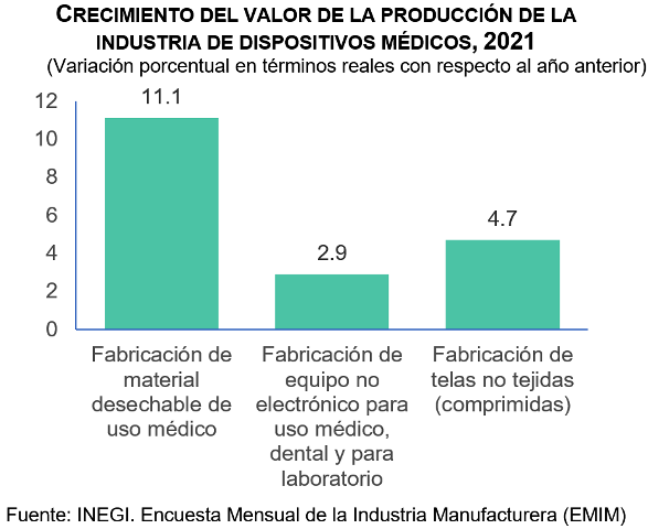 Por su parte, la fabricación de equipo no electrónico para uso médico, dental y para laboratorio tuvo una producción de mil 770 millones de pesos constantes en 2021. Lo anterior se tradujo en un crecimiento de 2.9 % en relación con 2020; y la fabricación de telas no tejidas (comprimidas) creció 4.7 % de 2020 a 2021.