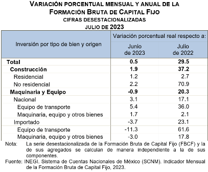 En julio de 2023 y con cifras desestacionalizadas, el Indicador Mensual de la Formación Bruta de Capital Fijo (IMFBCF) incrementó 0.5 % en términos reales, a tasa mensual.