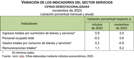 En noviembre de 2023, a tasa anual y con cifras ajustadas por estacionalidad, el índice agregado de los ingresos totales reales por suministro de bienes y servicios creció 2 %, el de personal ocupado total, 0.6 % y el de las remuneraciones totales, 6.2 por ciento. El de los gastos totales por consumo de bienes y servicios disminuyó 0.9 por ciento.