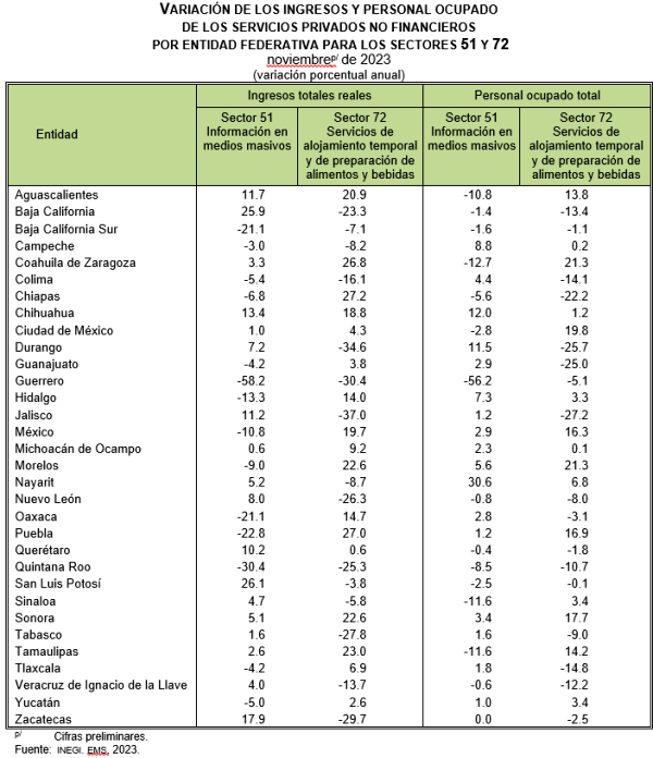 En el cuadro siguiente, se destacan resultados de sectores económicos presentes en cada una de las entidades federativas. Estos se refieren al sector 51, Servicios de información en medios masivos, así como al 72, Servicios de alojamiento temporal y de preparación de alimentos y bebidas -por ser los sectores que más participan en la variable de ingresos en las 32 entidades federativas-.