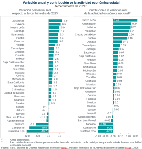 Durante el tercer trimestre de 2024 y con cifras ajustadas por estacionalidad, las entidades federativas que registraron los mayores incrementos en su actividad económica, a tasa trimestral, fueron Hidalgo, con un aumento de 5.9 %; Nuevo León, con 4.0 %; Guanajuato, con 2.7 %; San Luis Potosí, con 2.6 %, y Ciudad de México y Sinaloa, con 1.8 por ciento.