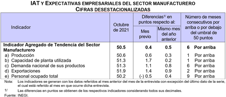 En su comparación mensual y con datos ajustados por estacionalidad, el Indicador Agregado de Tendencia del sector Manufacturero se ubicó en 50.5 puntos en octubre de este año, lo que implicó un incremento de 0.4 puntos frente al mes previo.