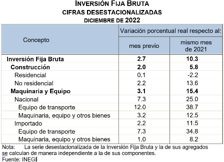 En diciembre de 2022, a tasa anual y con series desestacionalizadas, la Inversión Fija Bruta creció 10.3 % en términos reales. A su interior, los gastos en Maquinaria y Equipo total subieron 15.4 % y en Construcción, 5.8 por ciento.