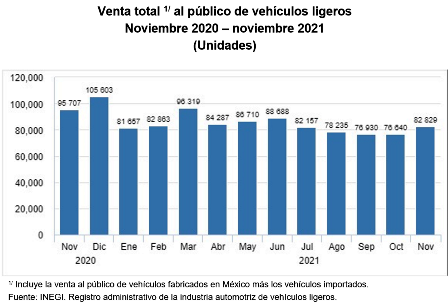 En noviembre se vendieron al público en el mercado interno 82 829 unidades. Por su parte, en el periodo enero-noviembre de 2021 se comercializaron 917 315 vehículos ligeros.