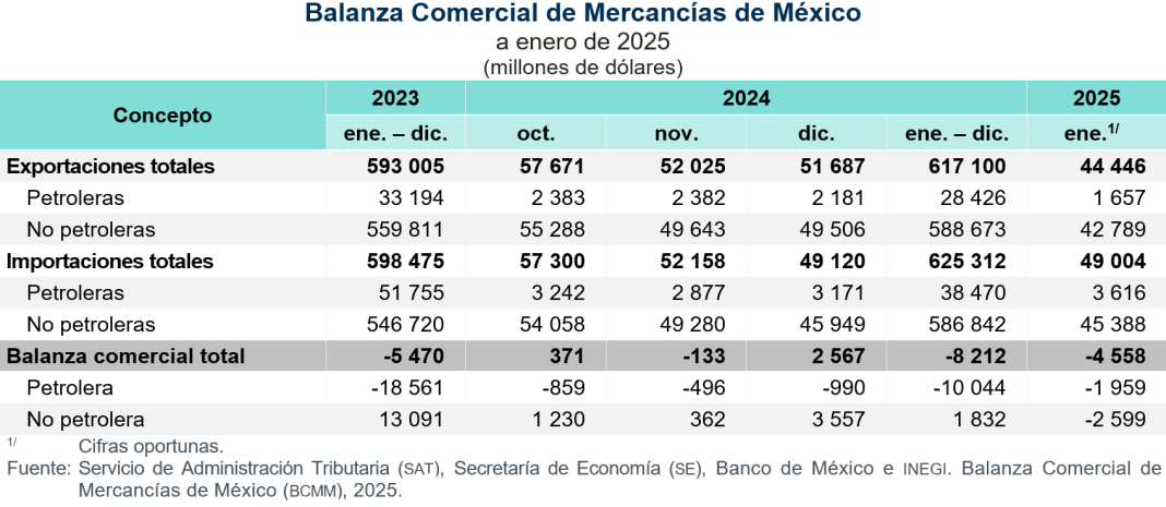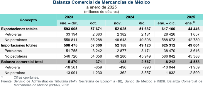 En enero de 2025, la información oportuna de comercio exterior indicó un déficit comercial de 4 mil 558 millones de dólares. Dicho saldo se compara con el superávit de 2 mil 567 millones de dólares reportado en diciembre de 2024.