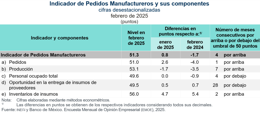 En febrero de 2025, con cifras desestacionalizadas, el IPM presentó un aumento mensual de 0.8 puntos y se ubicó en 51.3 puntos, de modo que hiló cuatro meses por arriba del umbral de los 50 puntos.
