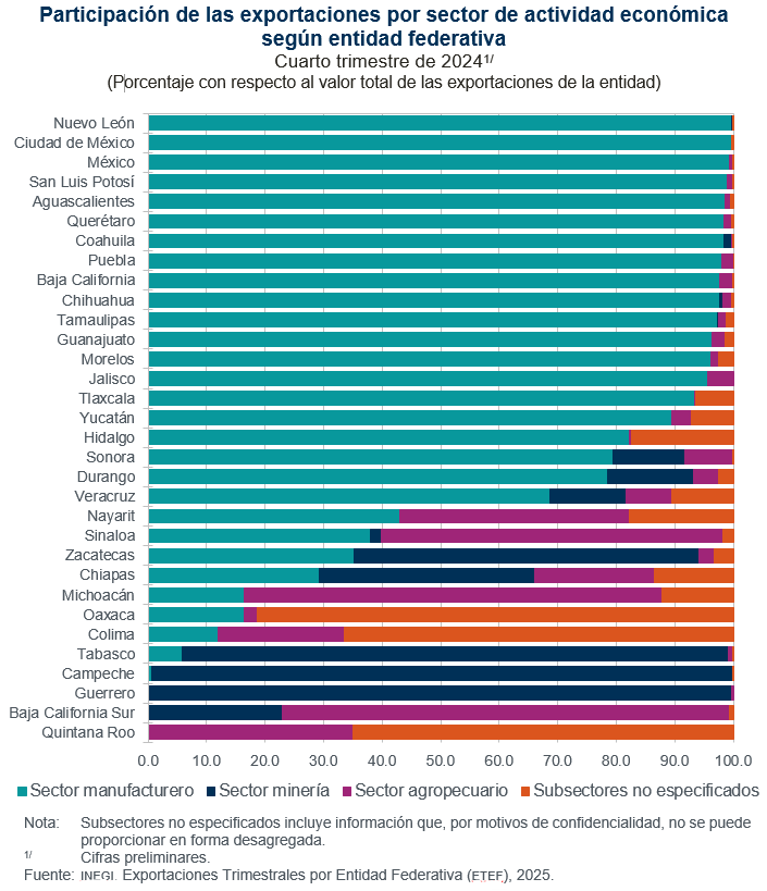 Al interior de las entidades federativas predominaron las exportaciones del sector manufacturero, con excepción de Baja California Sur, Guerrero, Campeche, Tabasco, Michoacán, Chiapas, Zacatecas y Sinaloa. En estas, sobresalieron las exportaciones del sector minero (petrolero y no petrolero) o del agropecuario.