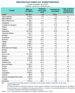 En el cuarto trimestre de 2024, el valor de las exportaciones de las entidades federativas alcanzó un monto de 144 391.1 millones de dólares. Destacó la participación de Chihuahua, con 13.9 % del total de las exportaciones; Coahuila, 11.9 %; Baja California, 10.6 %; Nuevo León, 10.5 %, y Guanajuato y Tamaulipas, con 6.6 % cada una. En conjunto, aportaron 60.2 por ciento.
