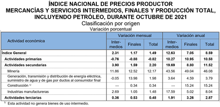 El Instituto Nacional de Estadística y Geografía (INEGI) informa que en el décimo mes de 2021 el Índice Nacional de Precios Productor (INPP) Total, incluyendo petróleo, registró un incremento de 1.49% mensual y de 8.59% anual. En igual mes de 2020 aumentó 0.07% mensual y 4.40% a tasa anual.