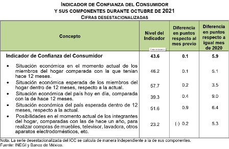 En octubre de 2021, el ICC se ubicó en 43.6 puntos, nivel que significó un avance mensual de 0.1 puntos con datos ajustados por estacionalidad.