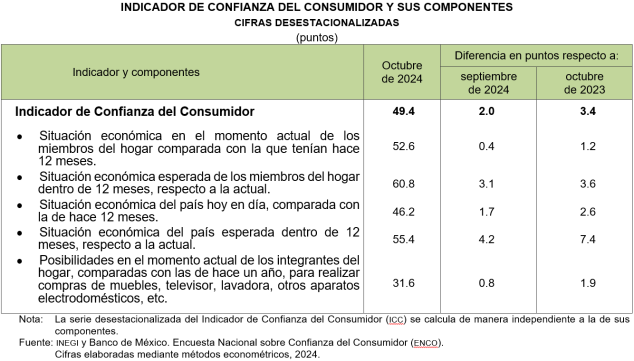 En octubre de 2024 y con cifras ajustadas por estacionalidad, el ICC se ubicó en 49.4 puntos, lo que implicó un incremento mensual de 2.0 puntos.
