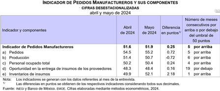 El Instituto Nacional de Estadística y Geografía (INEGI) y el Banco de México dan a conocer el Indicador de Pedidos Manufactureros (IPM) de mayo de 2024. El IPM se construye con los resultados de la Encuesta Mensual de Opinión Empresarial (EMOE), mismos que permiten conocer, casi inmediatamente después de terminado el mes de referencia, las expectativas y la percepción de las y los directivos empresariales sobre el comportamiento del sector manufacturero en México.