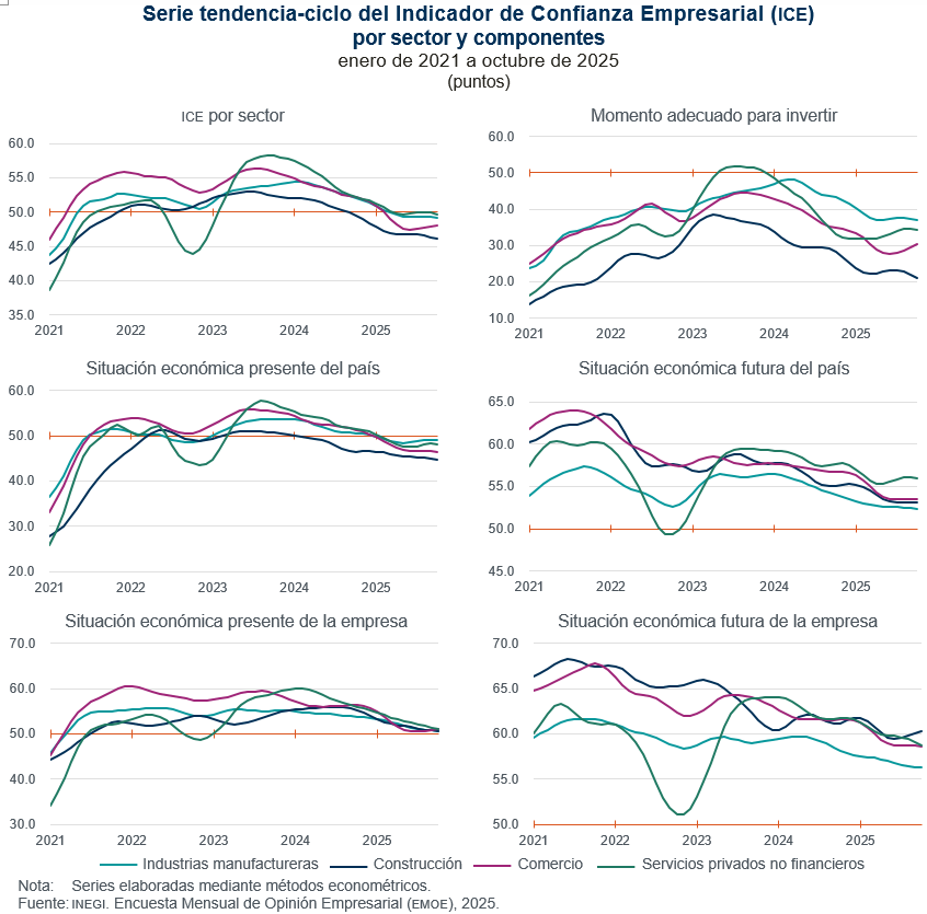 En octubre de 2025 y con cifras desestacionalizadas, el IGOEC —que es el promedio ponderado de los indicadores de los cuatro sectores que lo integran— fue de 48.6 puntos y representó una caída de 0.8 puntos en relación con el mes anterior y de 3.4 puntos, en su comparación anual. Con esta última observación, el indicador suma ocho meses seguidos por debajo del umbral de los 50 puntos.