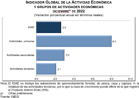 En diciembre de 2022 y con cifras desestacionalizadas, el Indicador Global de la Actividad Económica (IGAE) creció 0.3 % a tasa mensual.