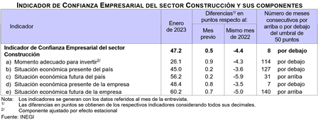 Con cifras originales, el Indicador Global de Opinión Empresarial de Confianza (IGOEC) —que es el promedio ponderado de los indicadores de los cuatro sectores que lo integran— fue de 44.3 puntos en enero de 2023, lo que representa una caída de 7.6 puntos con relación al mismo mes de 2022.