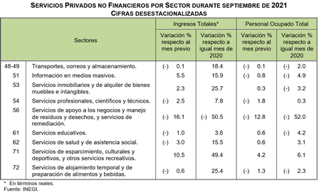 Con cifras desestacionalizadas, durante septiembre de 2021 los Ingresos Totales reales por Suministro de Bienes y Servicios de los Servicios Privados no Financieros descendieron 0.1%, el Personal Ocupado Total se redujo 2.7%, las Remuneraciones Totales reales 0.8% y los Gastos Totales por Consumo de Bienes y Servicios, que es el importe que destinaron los establecimientos o empresas al consumo de bienes y servicios para realizar su actividad económica, disminuyeron 1% respecto al mes inmediato anterior.