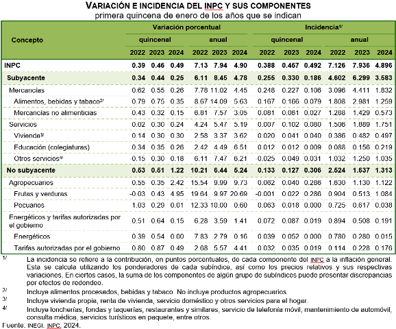 En la primera quincena de enero de 2024, la variación anual del INPC fue de 4.90 % y la de los índices subyacente y no subyacente de 4.78 y 5.24 %, respectivamente. En el mismo periodo del año anterior, el INPC aumentó 7.94 % y sus componentes, 8.45 y 6.44 %, en ese orden.