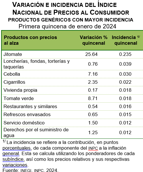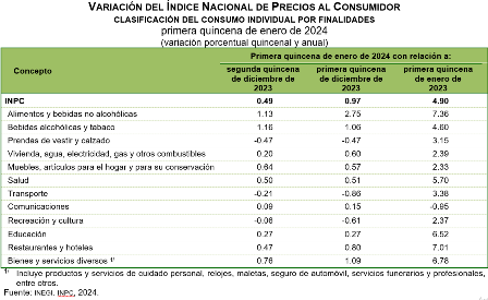 En la primera quincena de enero de 2024, el INPC presentó una variación de 0.49 % respecto a la quincena anterior. Con este resultado, la inflación general anual se ubicó en 4.90 por ciento. En la misma quincena de 2023, la inflación quincenal fue de 0.46 % y la anual, de 7.94 por ciento.