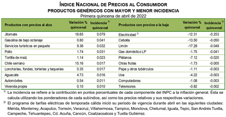 En la primera quincena de abril de 2022, el Índice Nacional de Precios al Consumidor (INPC) registró una variación de 0.16% respecto a la quincena anterior. Con este resultado, la inflación general anual se colocó en 7.72%. En igual periodo de 2021, la inflación quincenal fue de 0.06% y la anual de 6.05%.