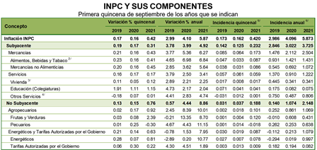 El Instituto Nacional de Estadística y Geografía (INEGI) informa que en la primera quincena de septiembre de 2021 el Índice Nacional de Precios al Consumidor (INPC) registró un crecimiento de 0.42 por ciento respecto a la quincena inmediata anterior; con este resultado la inflación anual se ubicó en 5.87 por ciento. En el mismo periodo de 2020 la inflación fue de 0.16 por ciento quincenal y de 4.10 por ciento anual.