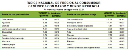 El Instituto Nacional de Estadística y Geografía (INEGI) informa que en la primera quincena de agosto de 2021 el Índice Nacional de Precios al Consumidor (INPC) disminuyó 0.02 por ciento respecto a la quincena inmediata anterior; con este resultado la inflación anual se ubicó en 5.58 por ciento. En el mismo periodo de 2020 la inflación fue de 0.24 por ciento quincenal y de 3.99 por ciento anual.